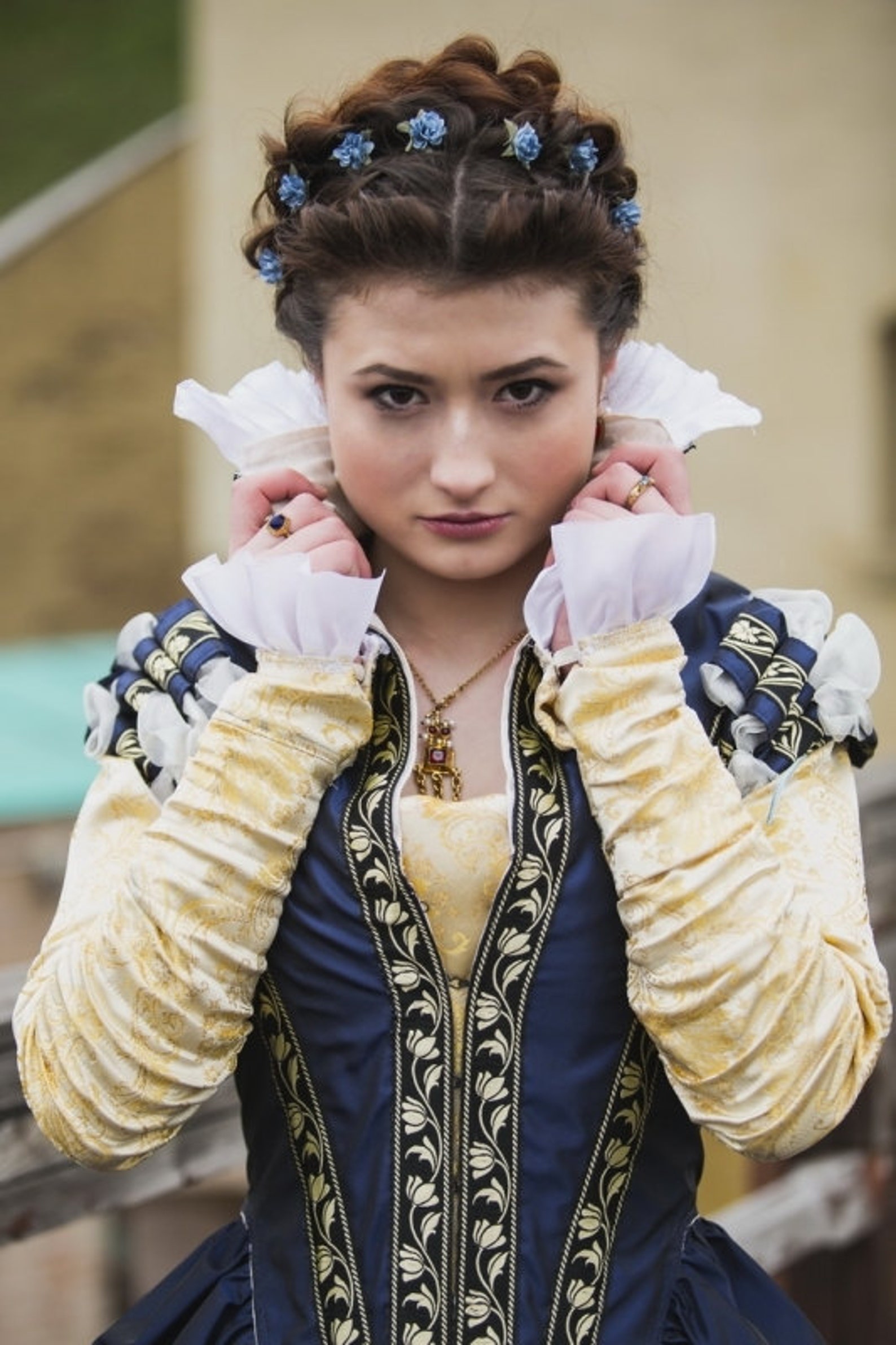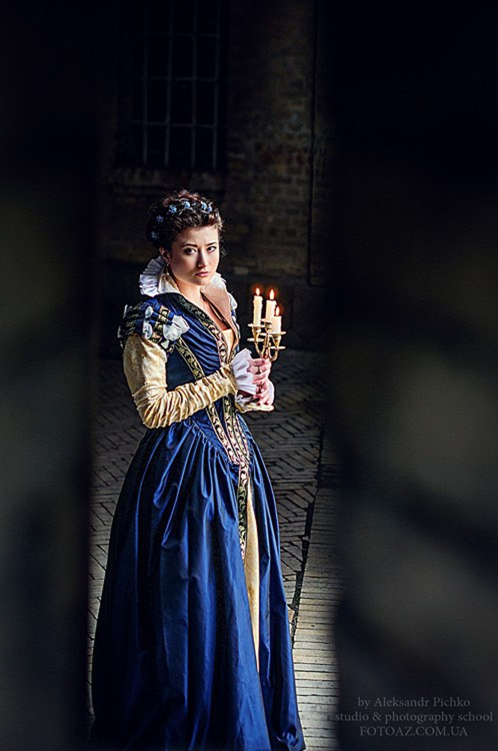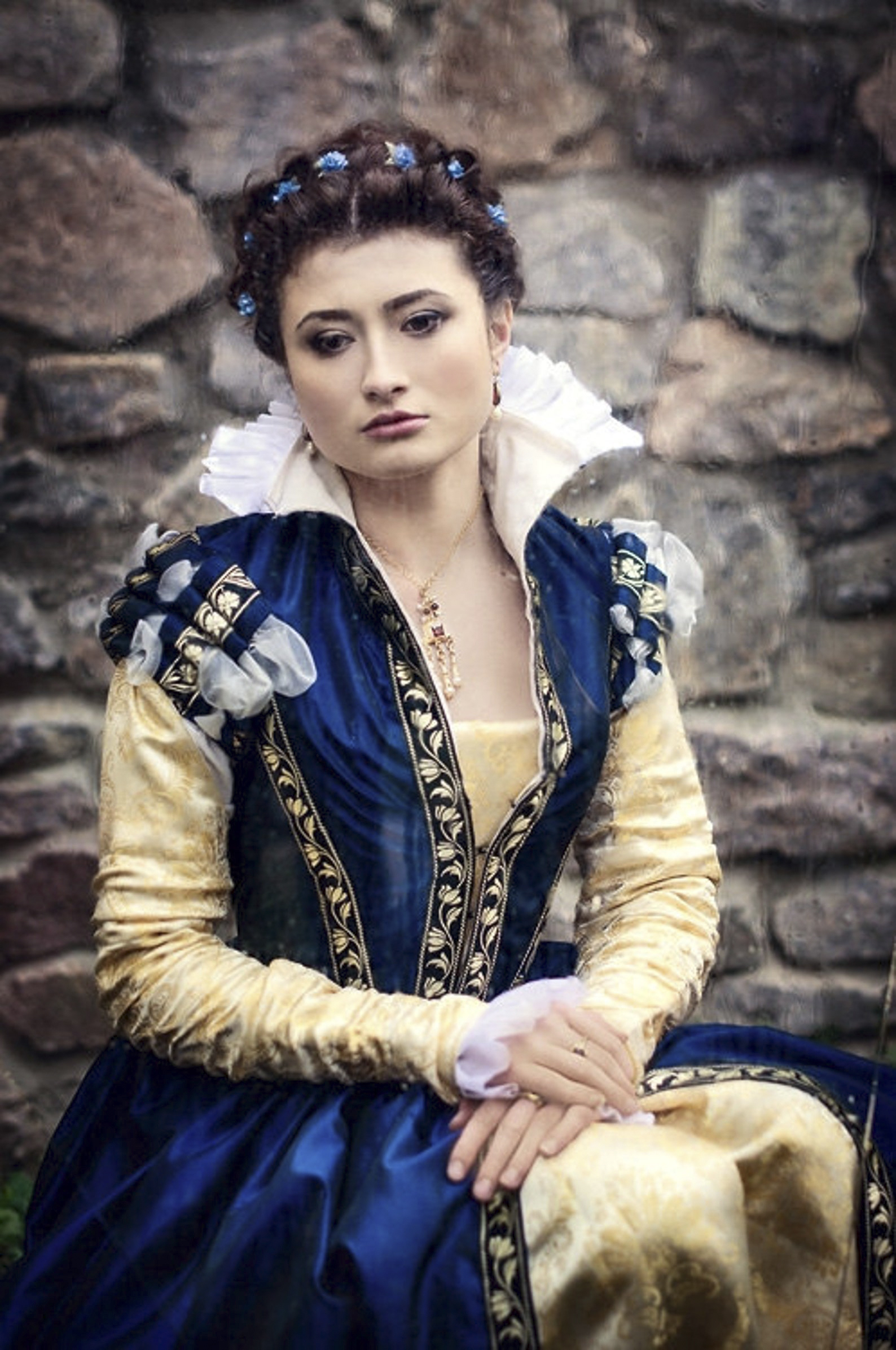 The dress was fashioned to be worn over the proper undergarments of the times (corset and chemise, which are not included with this listing). The gown consists of the goldish underskirt, the dress itself and the goldish stomack detail. The dress has boned bodice and one-layer skirt. It is made of taffeta. The boice closes in the front with small hooks. Sleeves are a separate detail and laced to the bodice, which is historically correct for 16th century costume. The golden petticoat can be worn separately. Central golden ‘stomack’ detail is pinned to a corset or a dress.