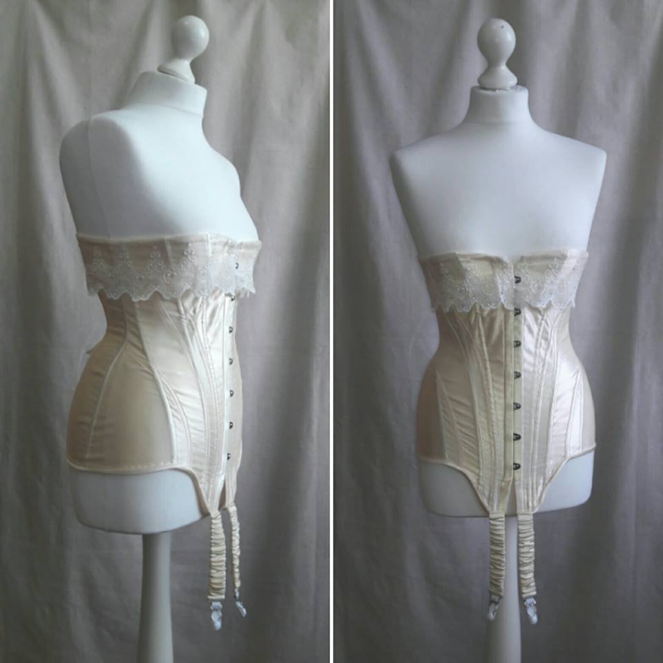 A set of Edwardian lingerie, which consists of the one-layered vanilla colour corset, white batiste camisolle and petticoat.