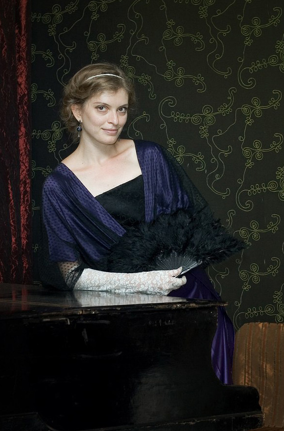 Gentle violet Edwardian style dress with black lace accent – a perfect thing for stunning appearence at the ball or evening. Soft violet satin flowing folds outline a graceful female silhouette.