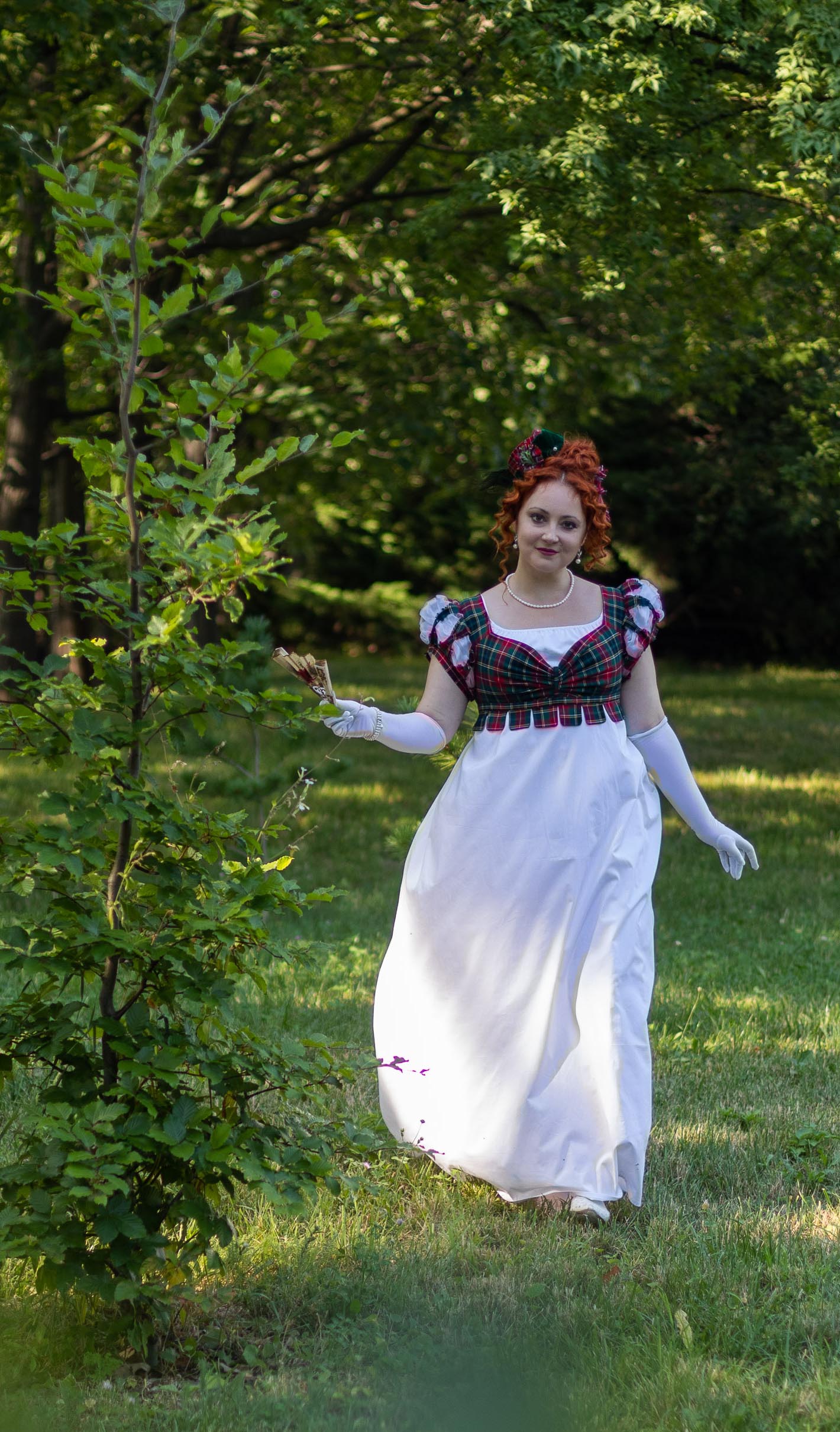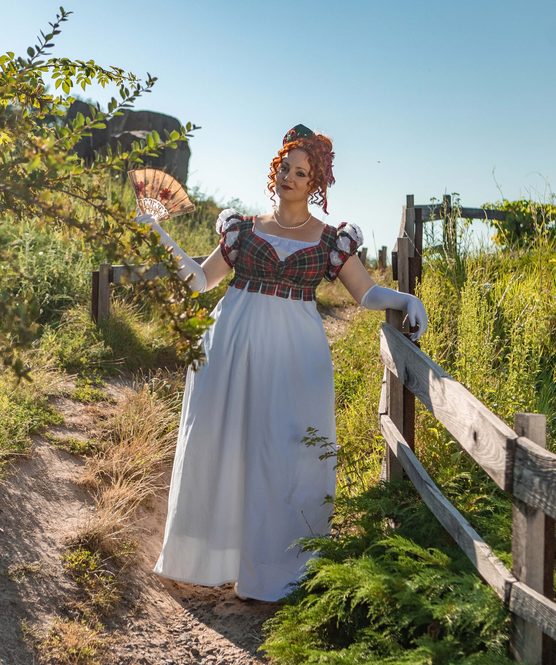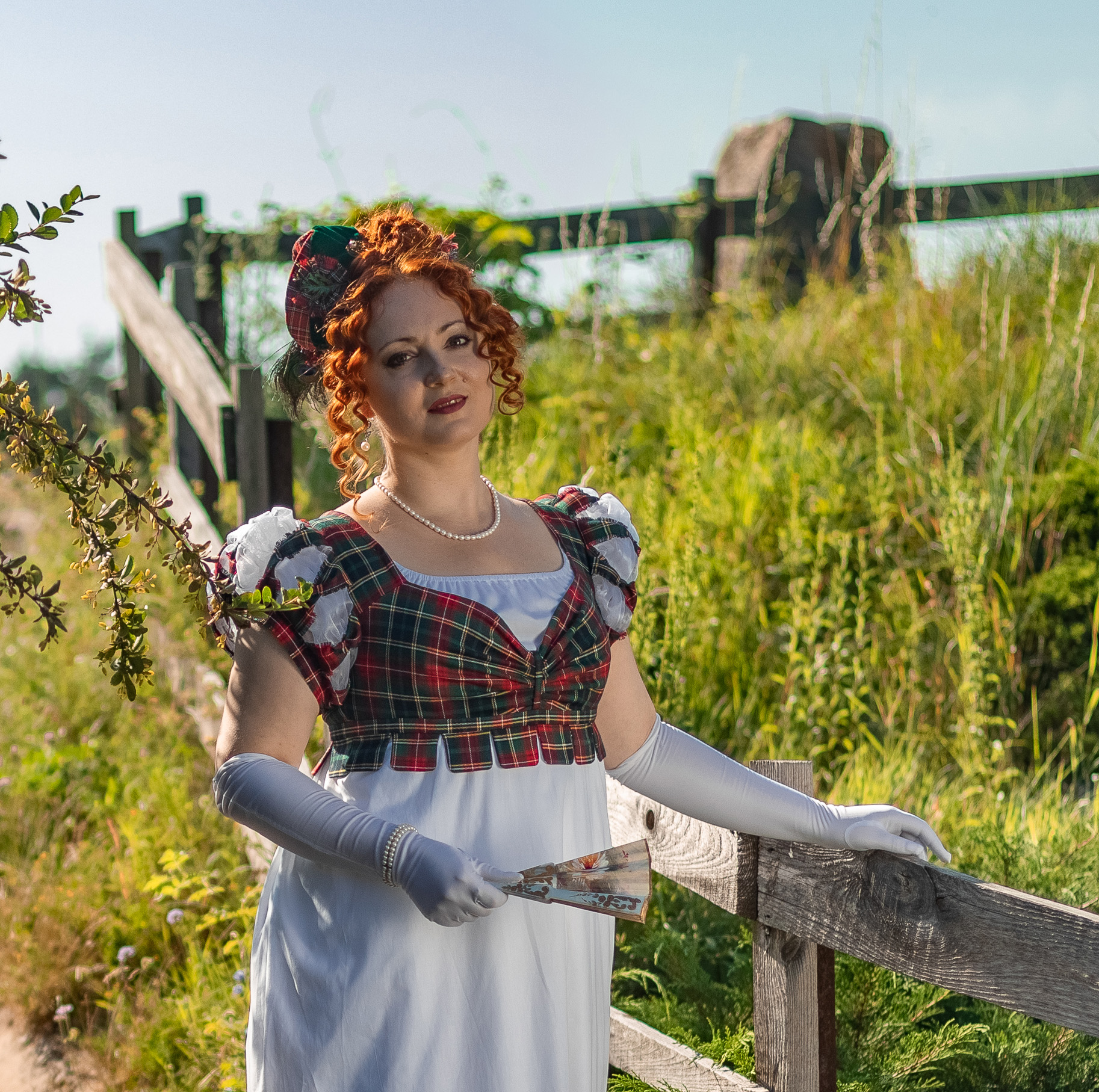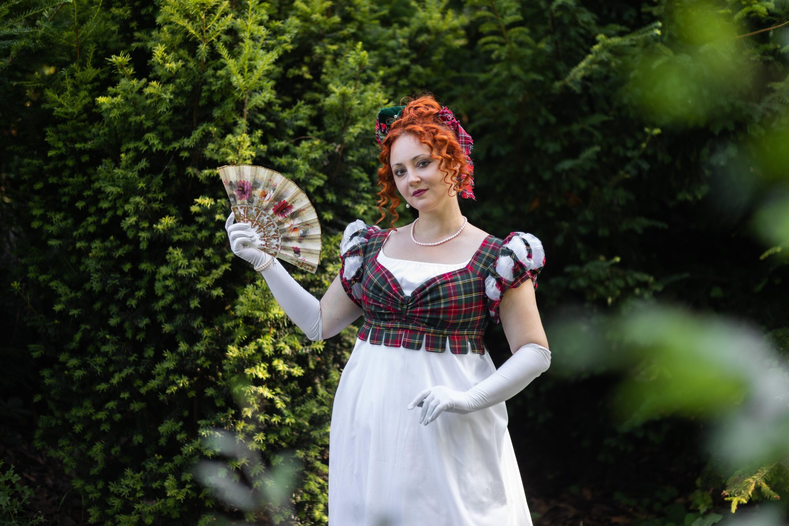 Regency bodice made to pop up on the plainer 1800s dresses looks. It allows to make your old dress more versatile and interesting without changing it. Made of plaid costuming fabric, it has puffy sleeves with organza puffs poking out, multiple folds and flirty tipets on the bodice bottom. The bodice is closed on back lacing, so is adjustable and may be used as stays.
