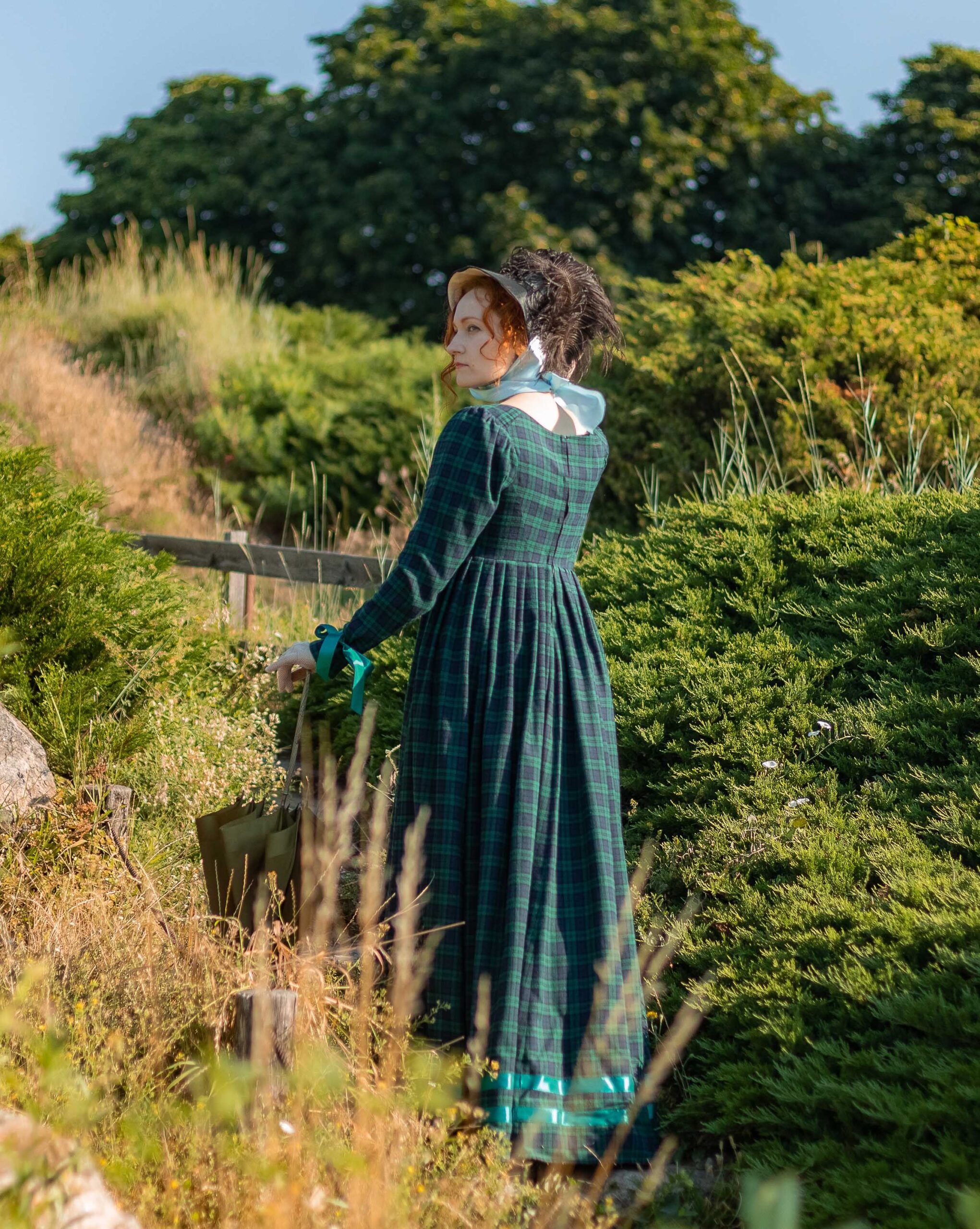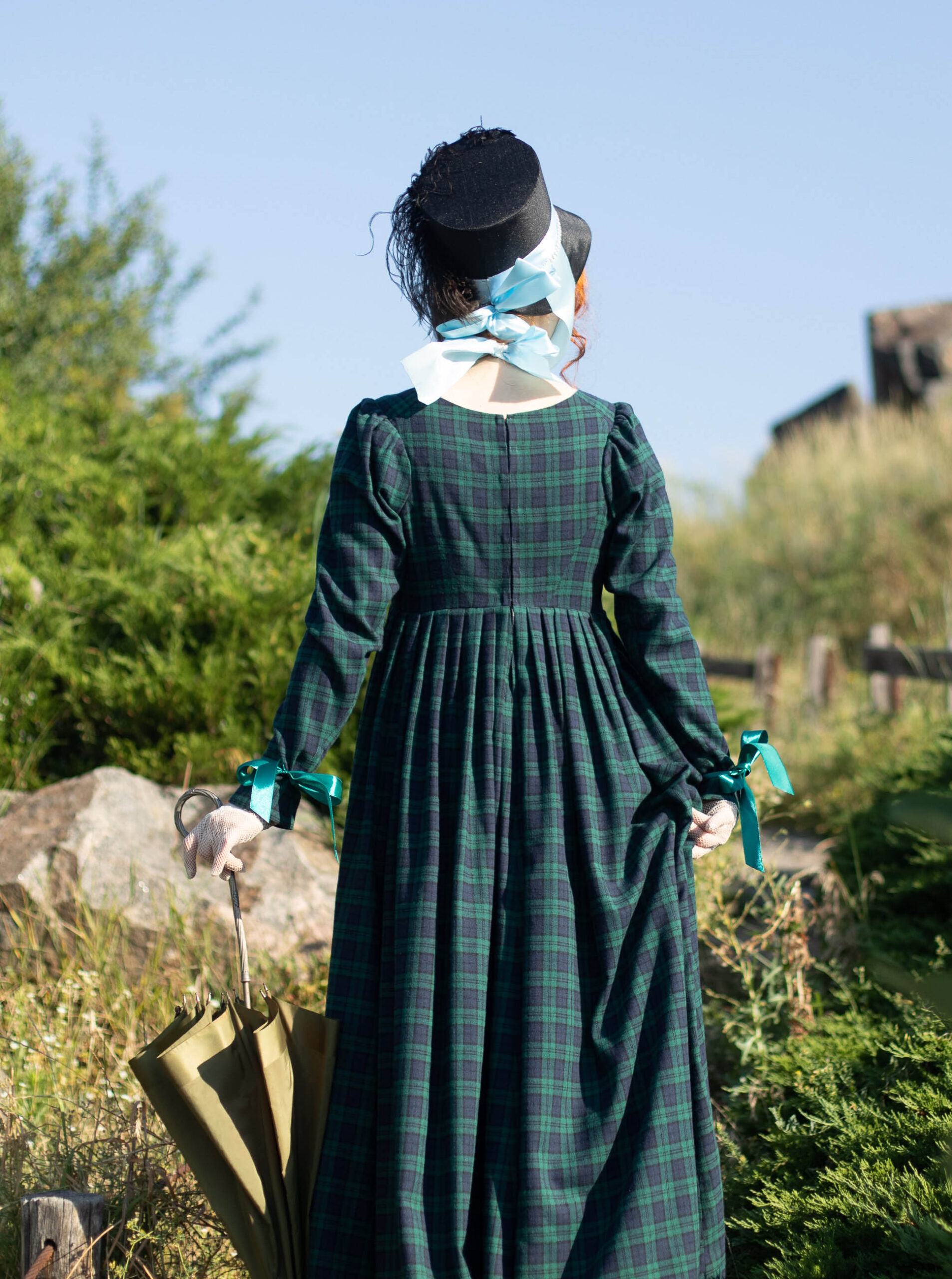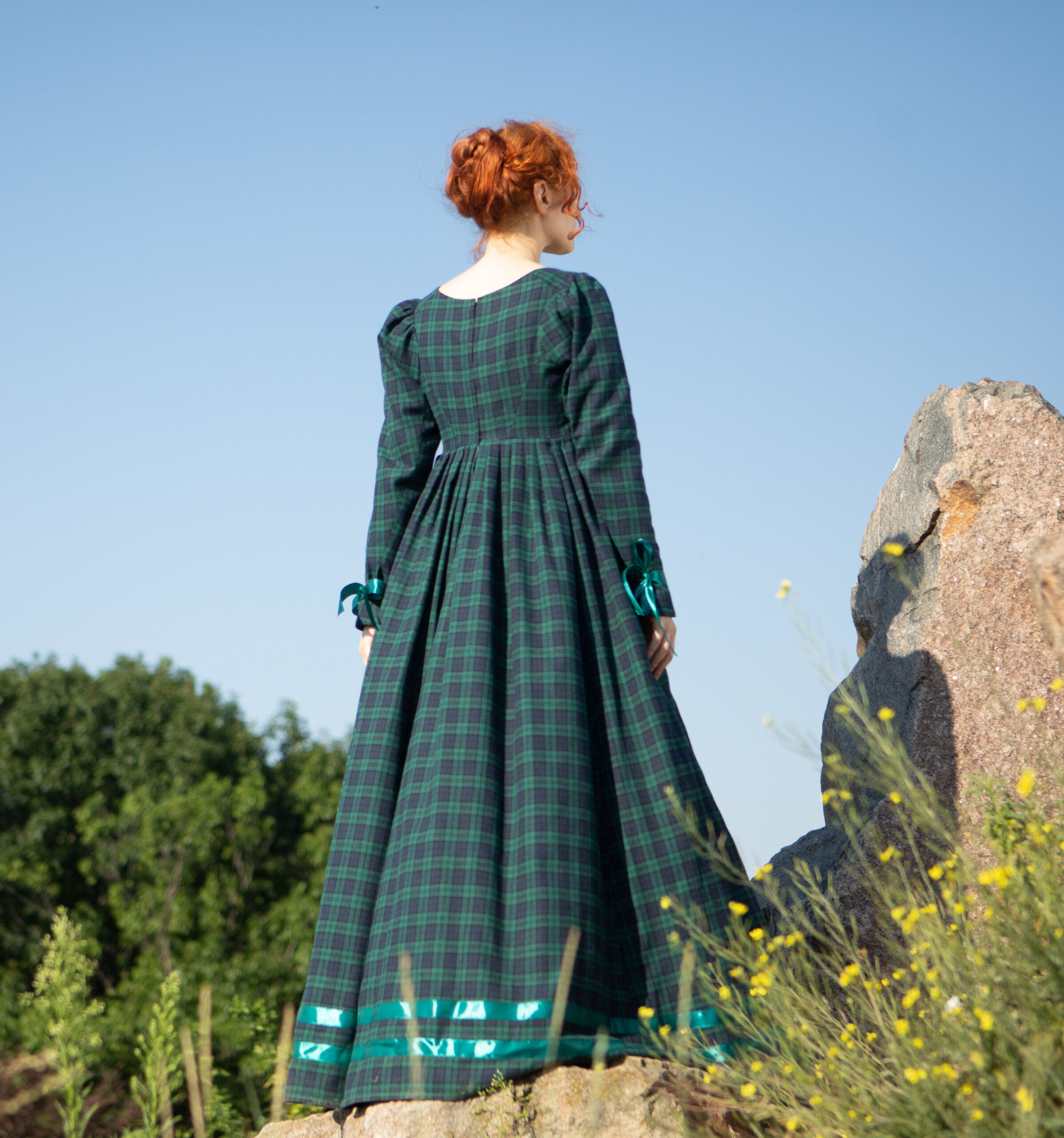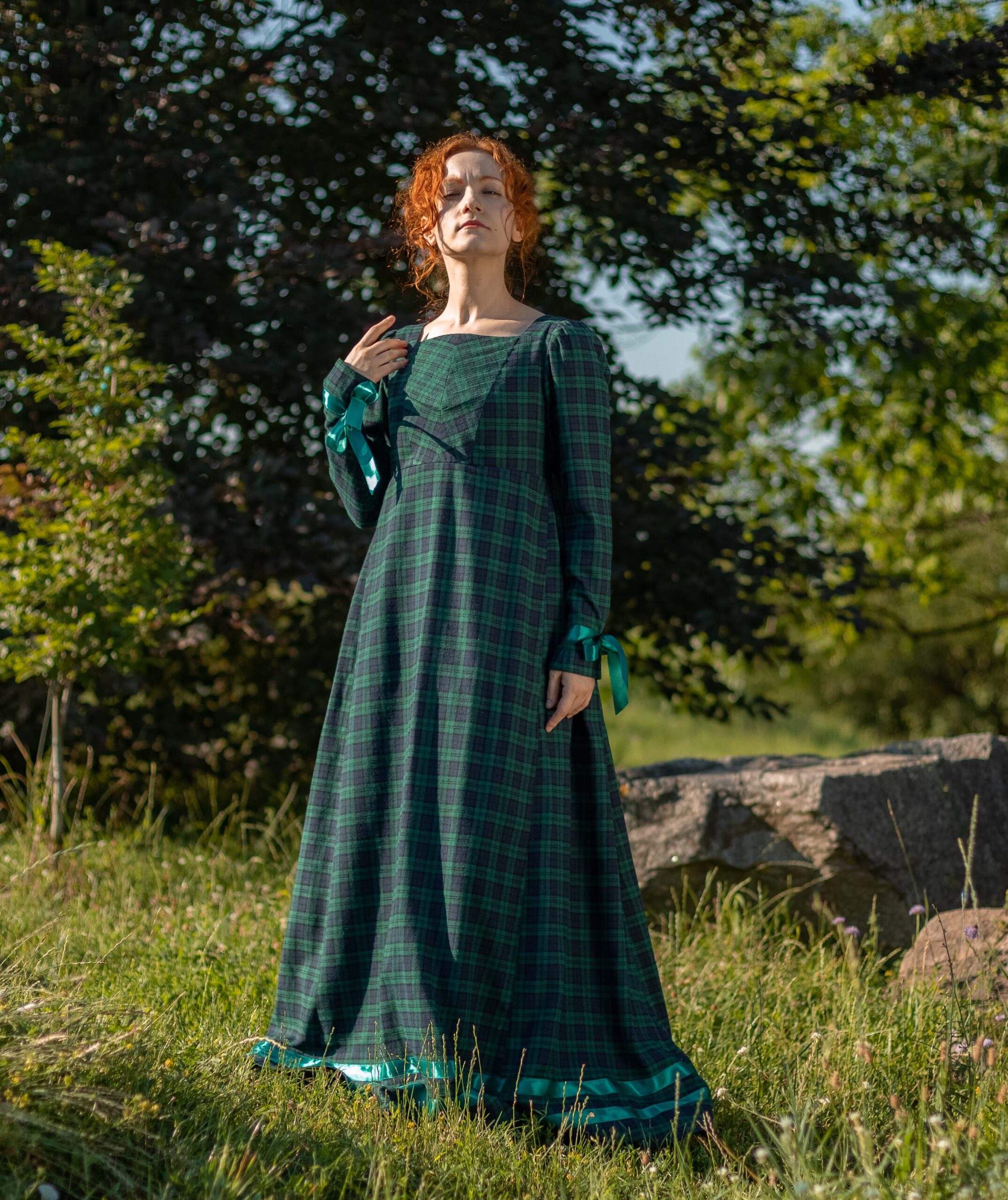 My heart’s in the Highlands – Scottish themed 1800s late Regency gown for long countryside walks and rainy day visits. Made of warm and soft plaid cotton fabric, it feels rather comfortable for cool weather.