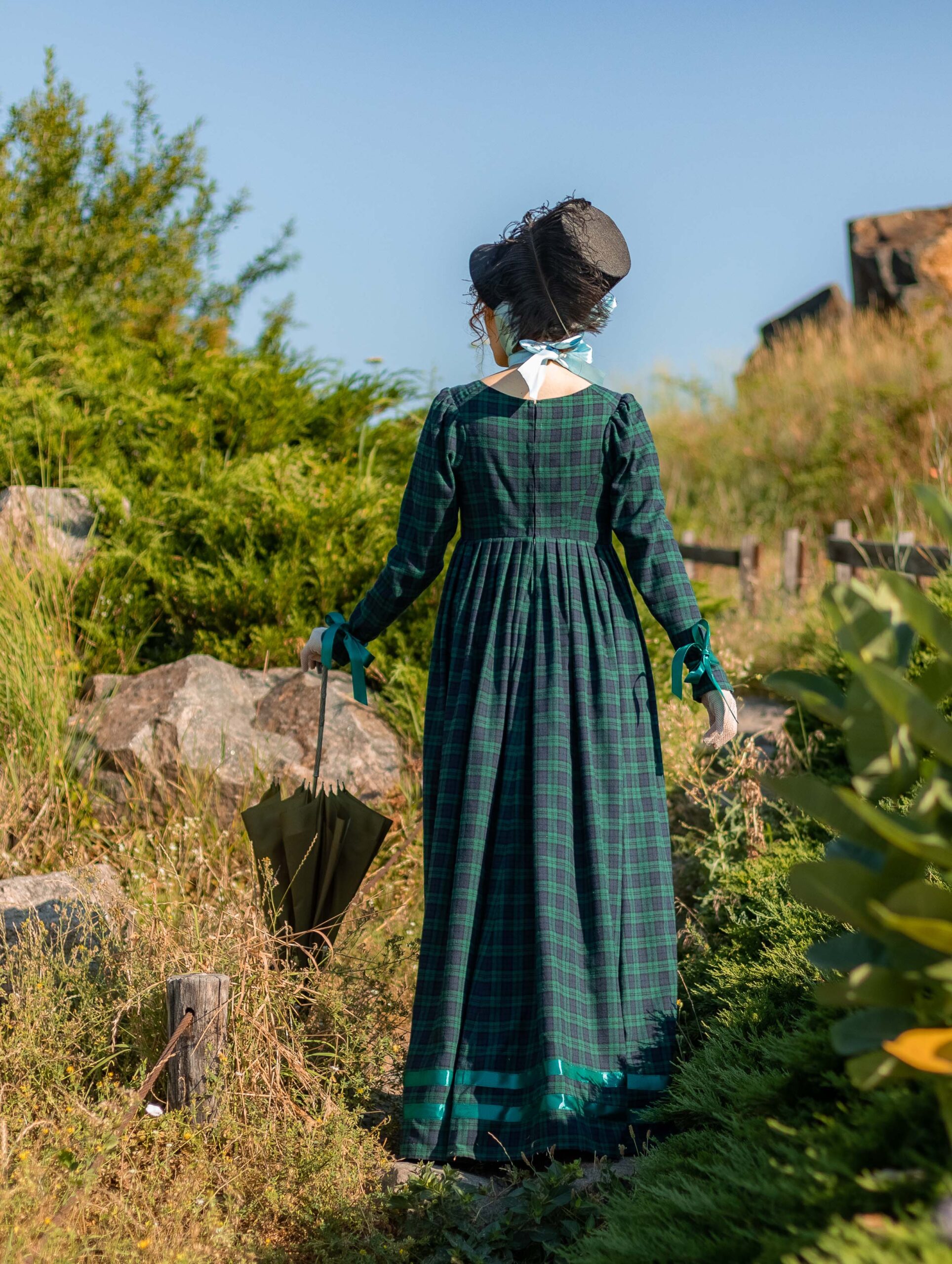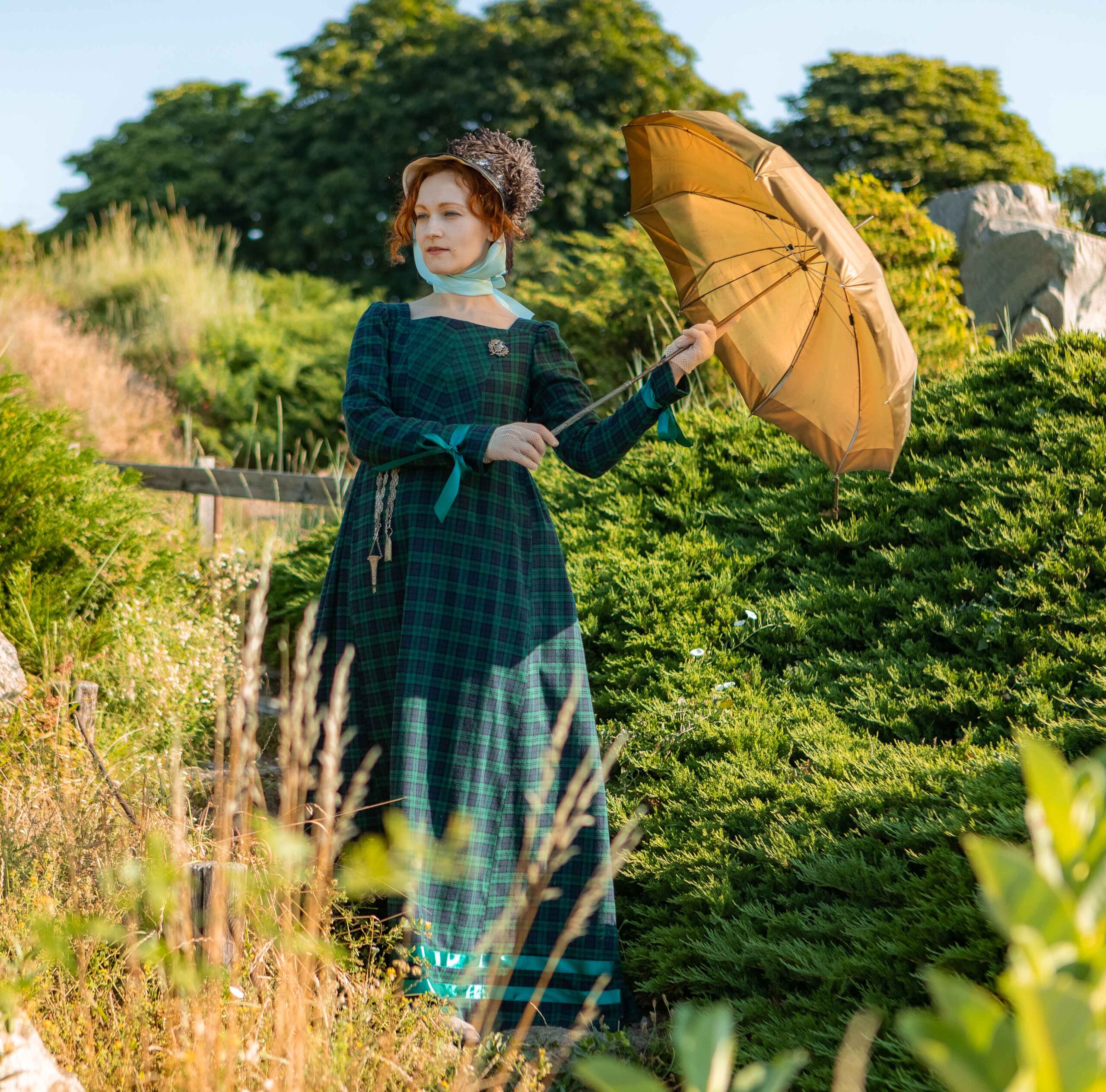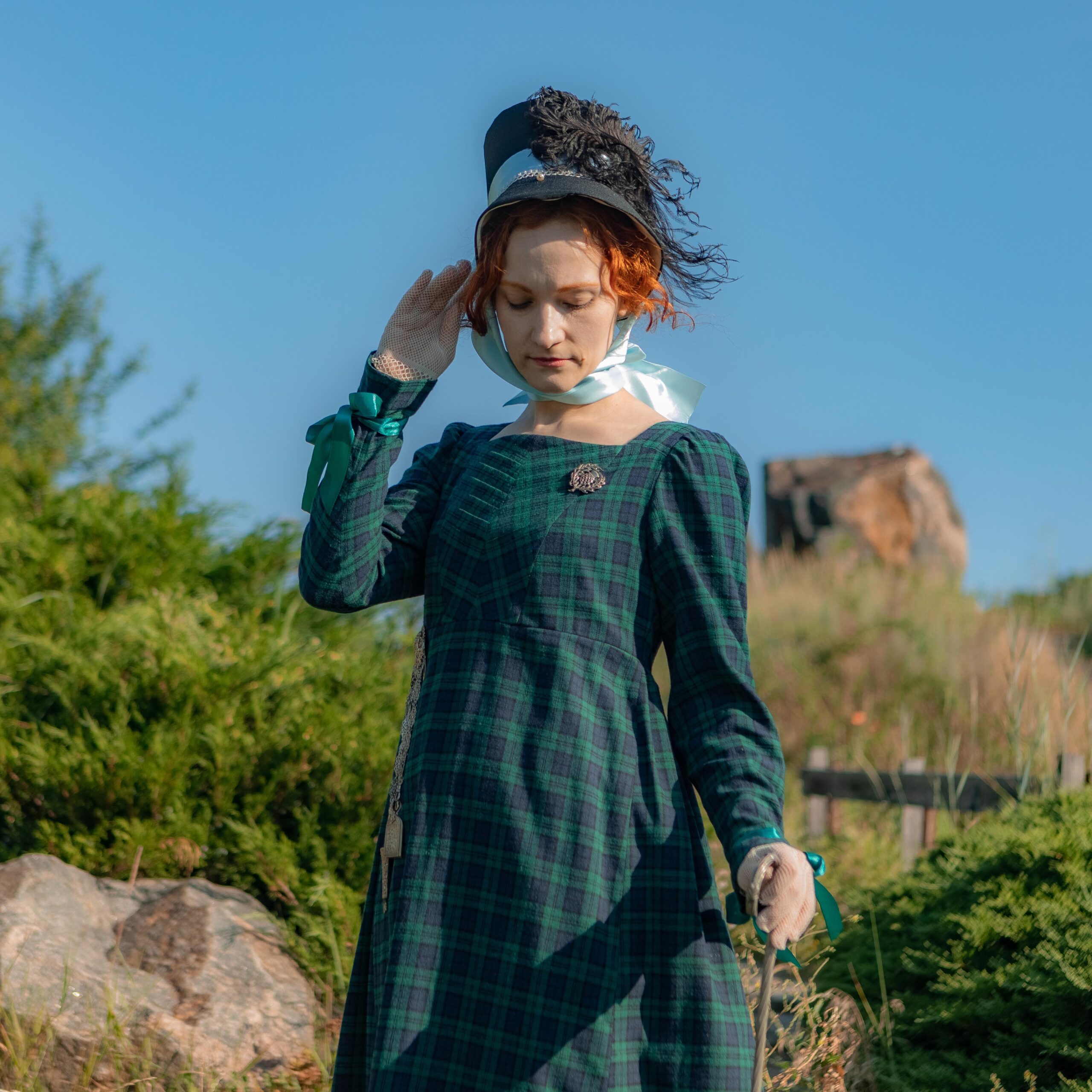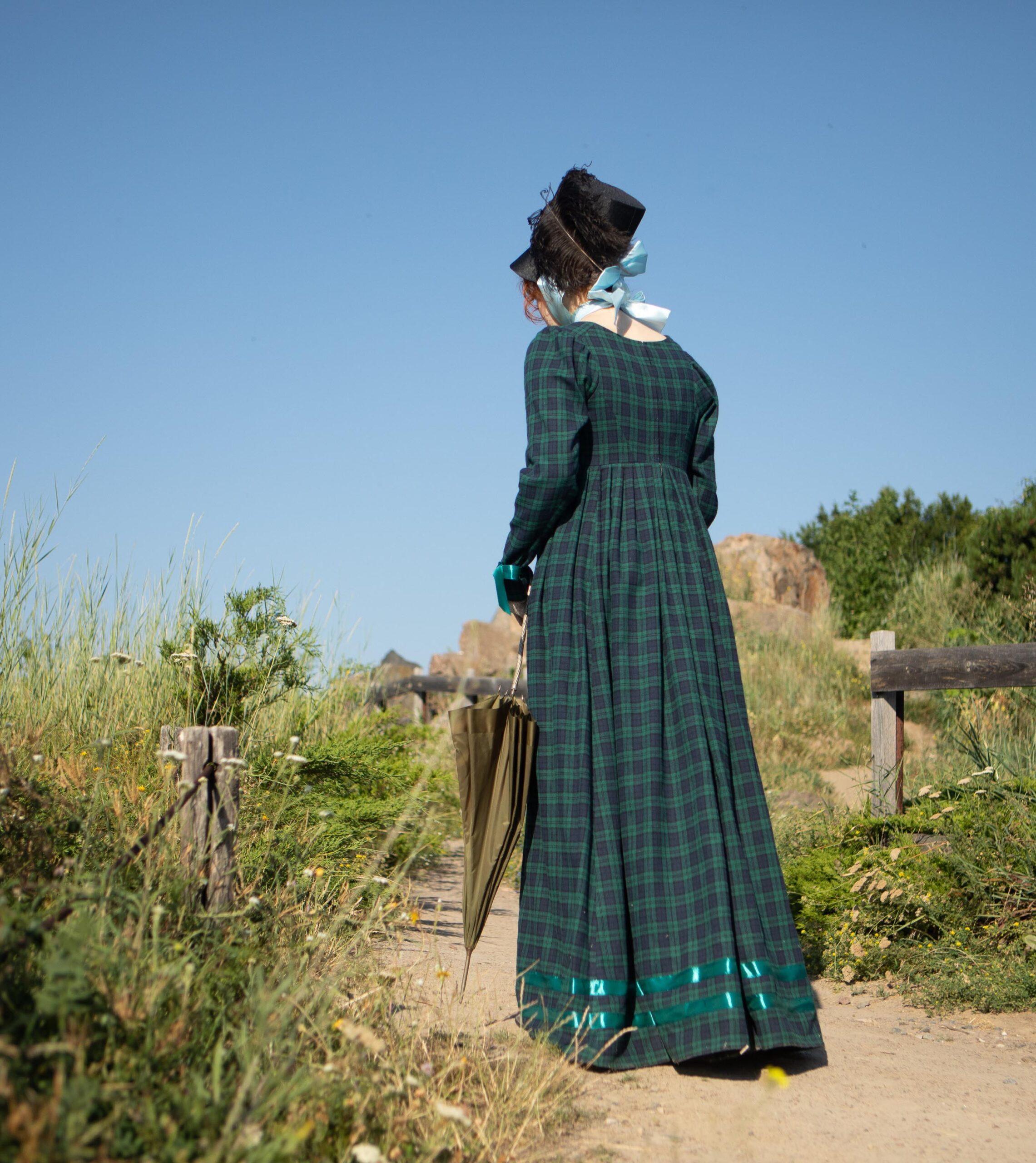My heart’s in the Highlands – Scottish themed 1800s late Regency gown for long countryside walks and rainy day visits. Made of warm and soft plaid cotton fabric, it feels rather comfortable for cool weather.