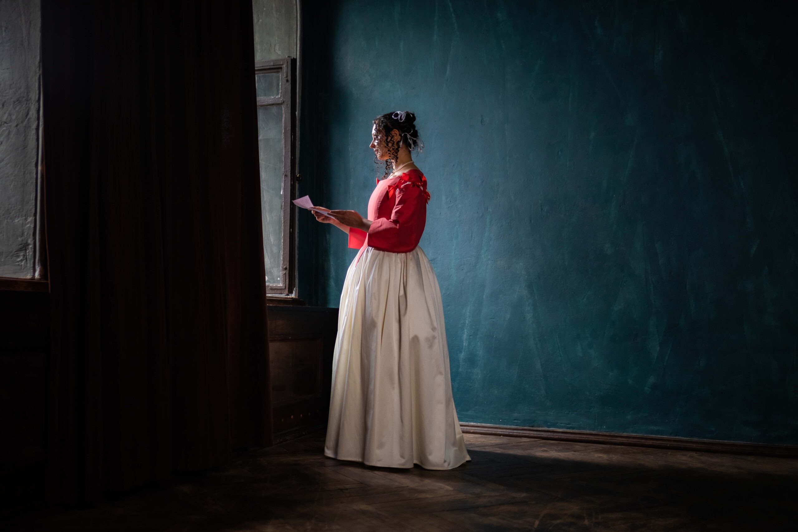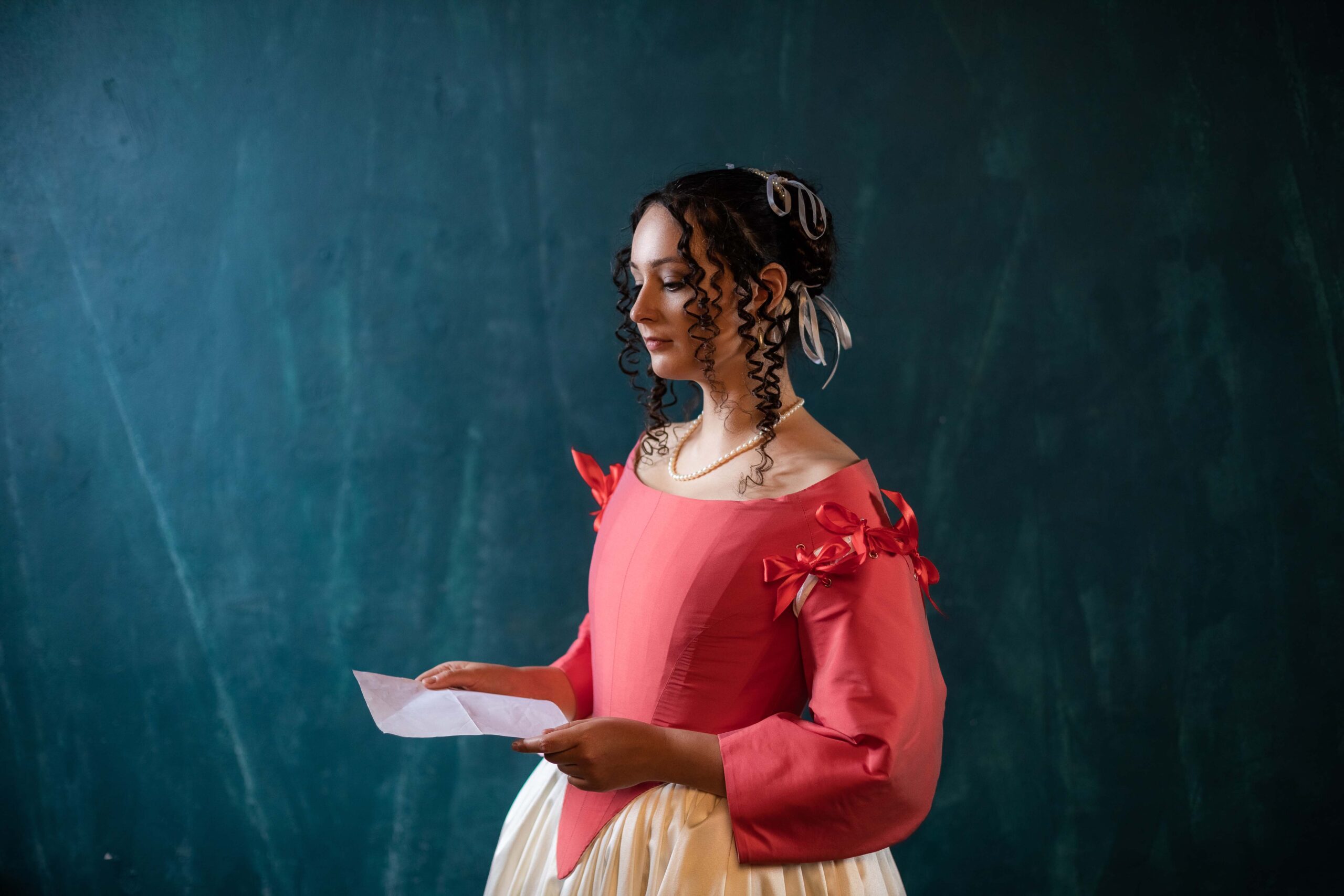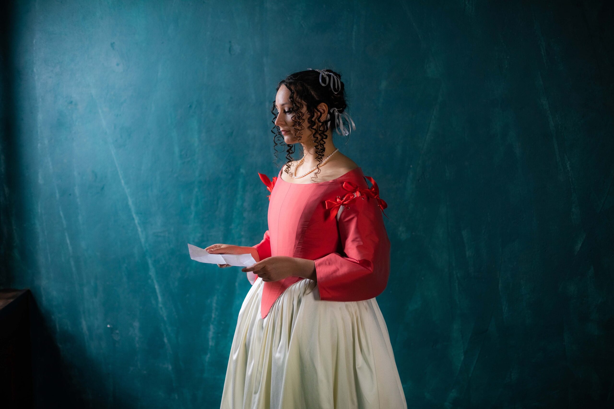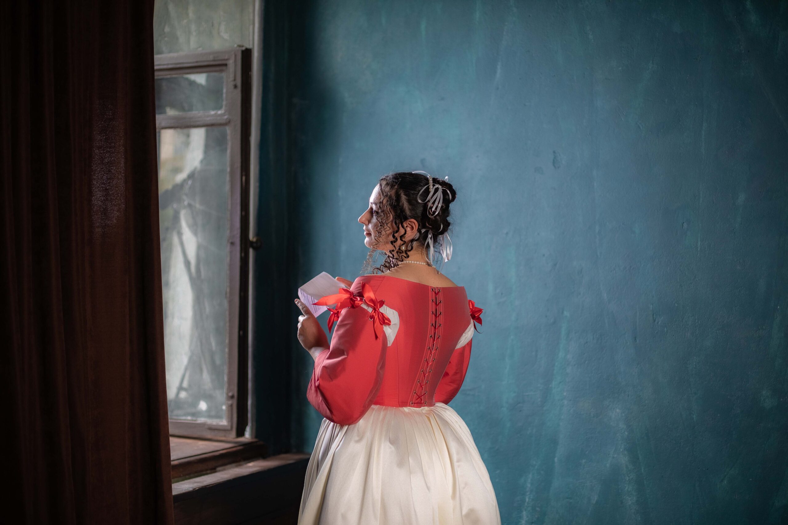 Gorgeous 17th-century set of coral red taffeta bodice and ivory skirt of cotton satin. The creation of this model was highly inspired by Johannes Vermeer’s ‘Lady reading at an open window’ and other Dutch Golden Age paintings.