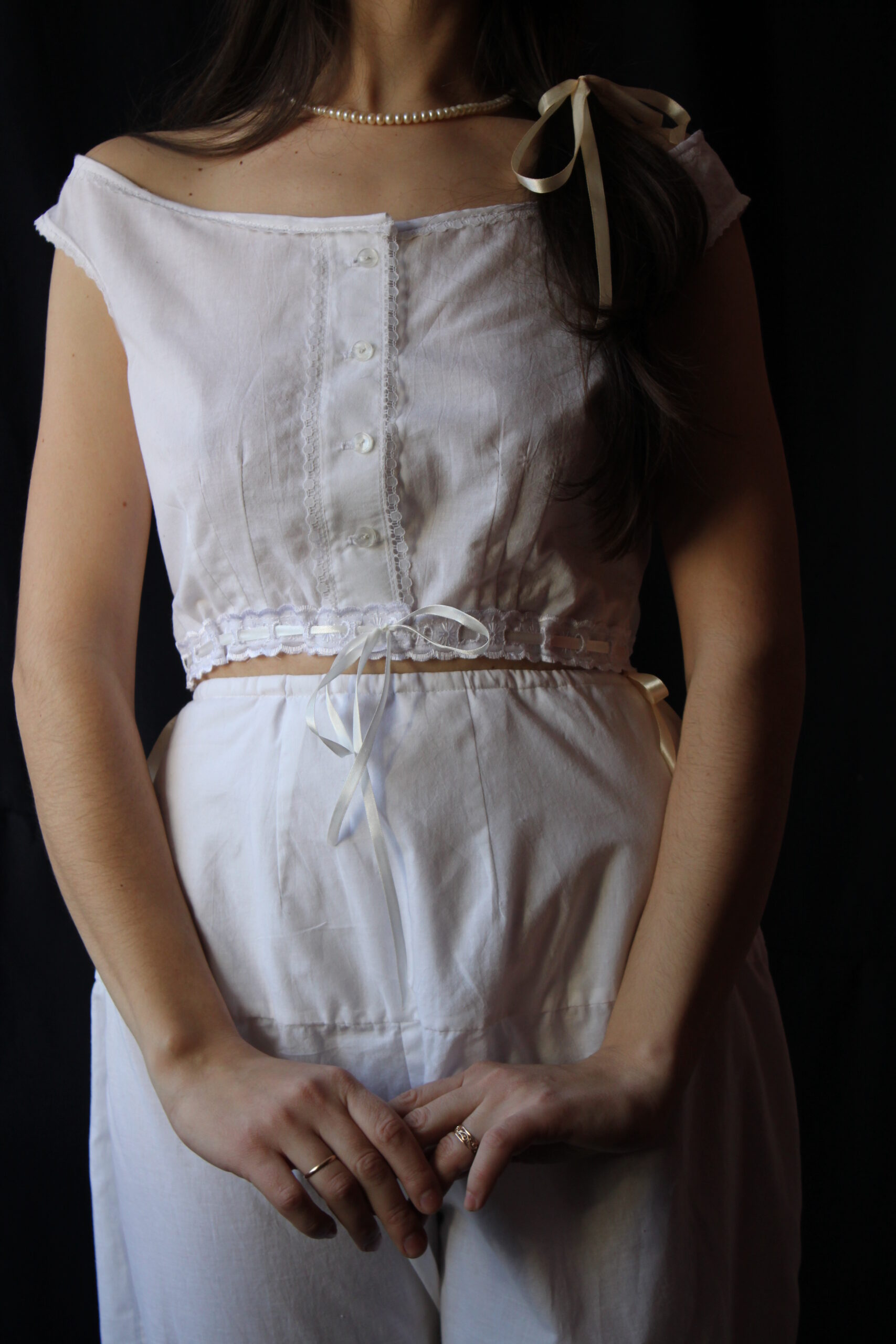 A delicate white camisole done after 1860s original pattern. It’s boat neck makes a feminine silhouette. Can be used both as a chemise (under-corset layer) or as a camisole (corset cover).