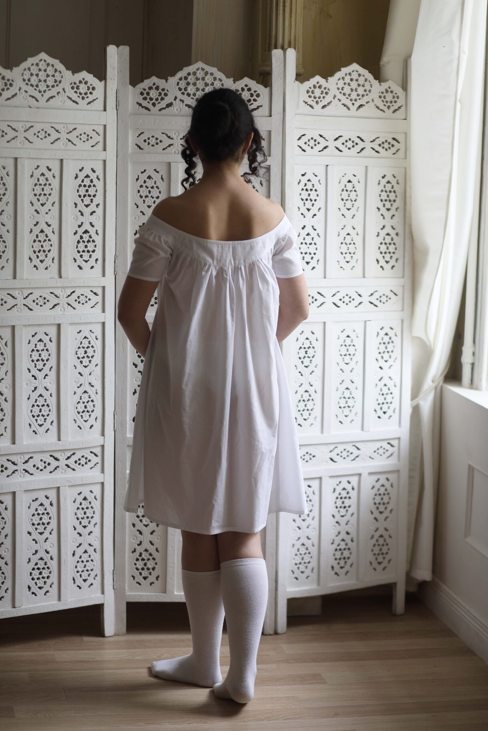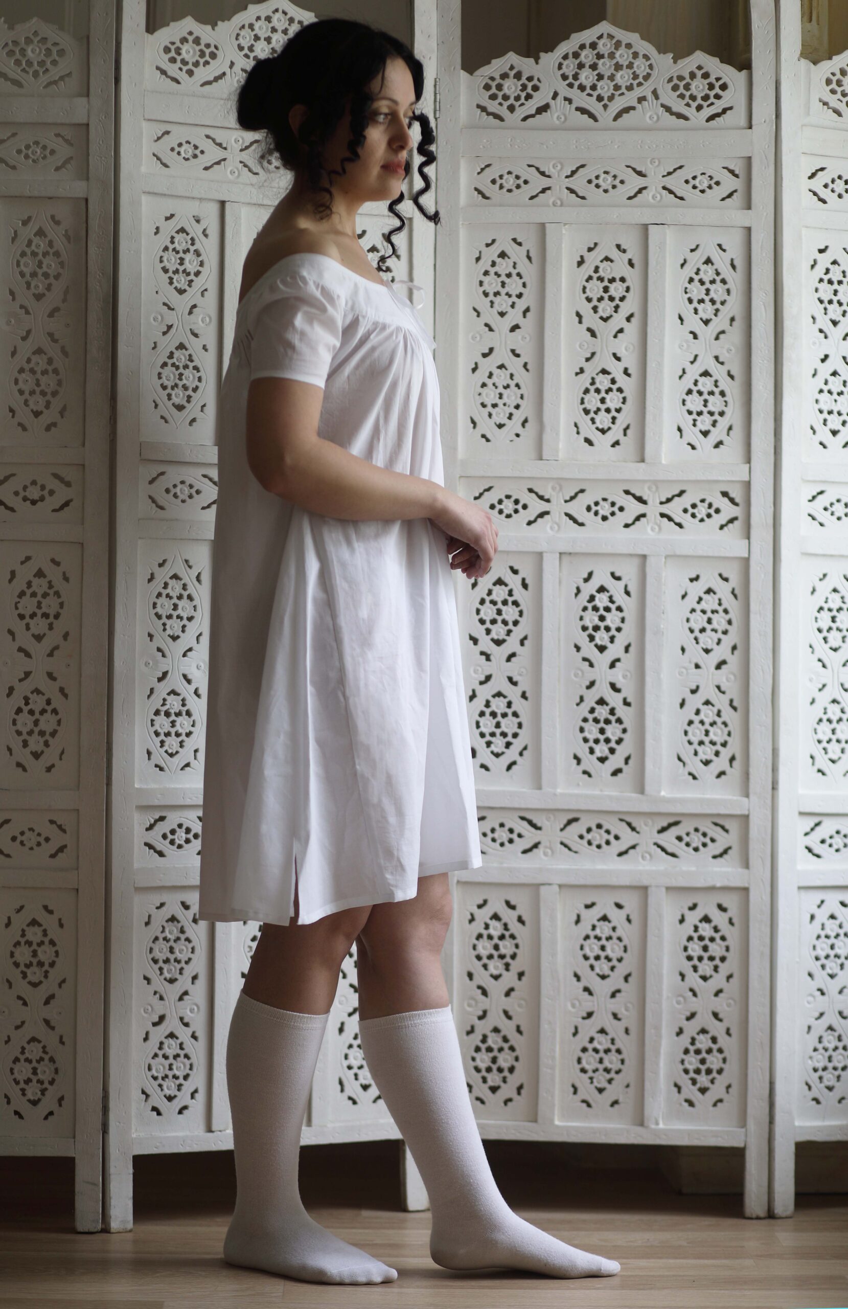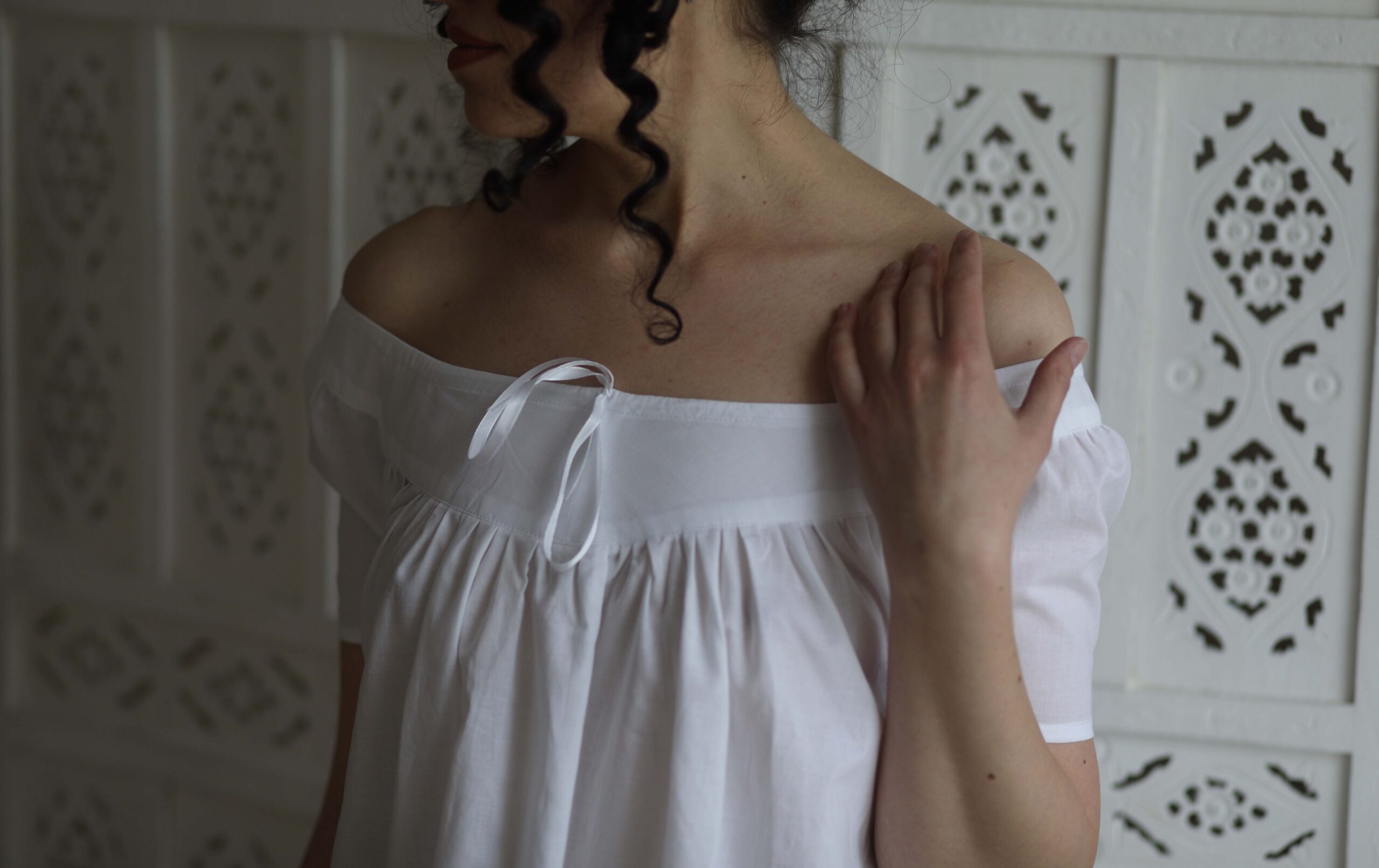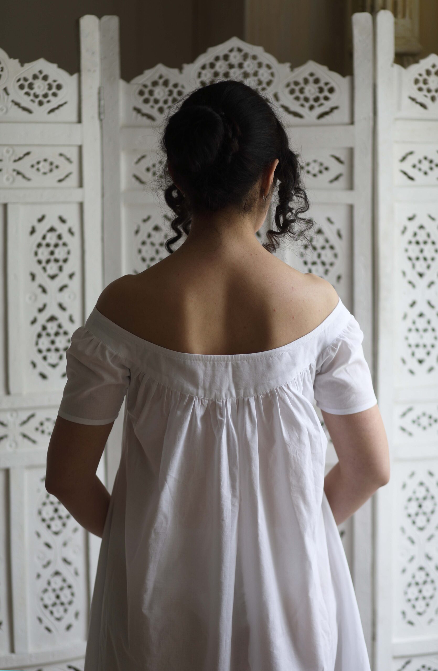 White cotton batiste chemise with boat neck. Suitable for all kinds of 19th century ballgowns and open decollete outfits. Knee length, short sleeves